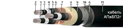 2г - Двойная герметизация: алюмополимерная лента, сваренная с оболочкой, для защиты от проникновения влаги в сочетании с продольной герметизацией водонепроницаемыми лентами Элементы конструкции кабеля АПвБП2г: